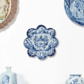 in maiolica decorata a monocromia blu e realizzata a stampo, presenta un cavetto centrale quadrato delimitato da un cordolo rialzato attorno ad otto lobature concave a guisa di valva di conchiglia, e poggia su otto piedini rilevati. Il decoro mostra al centro del cavetto un emblema araldico e intorno scene di putti. Al verso l’opera reca la marca con scudo, da attribuire genericamente a una fornace savonese del secolo XVII; cm 28x28, alt. cm 3,2