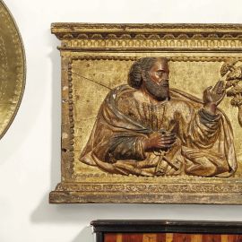 in legno intagliato, dorato e parzialmente dipinto in policromia, di forma rettangolare con struttura architettonica interessata da più ordini di intaglio, raffigura gli apostoli San Pietro, con le chiavi nella mano destra, e Sant'Andrea, mentre regge nella mano sinistra un libro e nella destra la croce, e sullo sfondo tra i due una coppia di alberi, cm 65x143x9