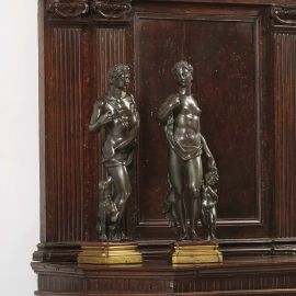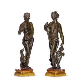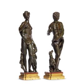 in bronzo patinato raffiguranti Meleagro e Atalanta, talvolta interpretate dalla critica anche come Endimione e Venere. Le due figure, originariamente realizzate per ornare degli alari da camino, trovano riscontro in numerose collezioni pubbliche e private e possono essere riferite alla produzione di Girolamo Campagna (Verona 1549 - Venezia 1625) per affinità esecutive e stilistiche, in particolare nel trattamento a larghi piani distesi, nella rigidezza formale delle pose e nella resa della capigliatura e dei piedi; cm 50x12x13 e cm 51x15x11 rispettivamente, montate su basi quadrangolari modanate in marmo rosso e bronzo dorato, alt. cm 6,5
