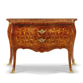 lastronato e intarsiato in legni vari, fronte e fianchi sagomati, piano intarsiato a motivi geometrici centrato da grande medaglione circolare con stella a dodici punte, fronte a due cassetti analogamente intarsiato con preziose bocchette in bronzo dorato, fianchi di linea analoga con medesimo motivo; gambe a sciabola calzate da ricchi piedini a foglie d'acanto in bronzo dorato, cm 86,5x128x61,5