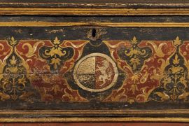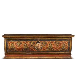in legno dipinto in policromia, fronte bombato riccamente decorato con motivi vegetali e semplici grottesche a fare da contorno allo stemma nobiliare inserito in un medaglione al centro; fianchi anch'essi decorati, cm 52,5x155x48. Completo di pedana in noce non pertinente, cm 14,5x156x48
