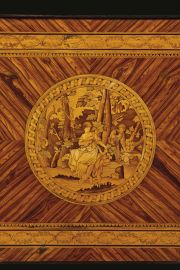 lastronato in varie essenze e parzialmente ebanizzato di forma rettangolare, piano interessato da ricco intarsio e centrato da medaglione raffigurante scena galante entro cornice a nastro ritorto, fascia interamente decorata da riserve ebanizzate intarsiate con vasi fra tralci fioriti, agli angoli piccole riserve rettangolari con cherubini sormontati da vasi, gambe ad obelisco con attacco a dado e piedini sferici, cm 74x60,5x47