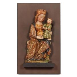 in legno intagliato a mezzorilievo e dipinto in policromia raffigurante Madonna col Bambino, la Vergine coronata è assisa in trono e trattiene sulla gamba sinistra il figlio stante; cm 29,2x14x4,5