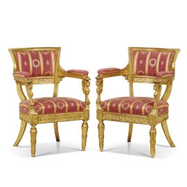 in legno intagliato e dorato con rivestimento in stoffa rossa con decori dorati, composto da divano, due poltrone e sei sedie; braccioli lineari sorretti da animali alati su zampe ferine, fascia frontale decorata a motivi stilizzati a rilievo, gambe anteriori tornite e posteriori a sciabola; divano cm 92x160x64, poltrone cm 88x60x62, sedie cm 90x50x52