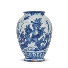 in maiolica dipinta in monocromia turchina, corpo ovoidale su un basso piede appena estroflesso, breve collo cilindrico con orlo piano estroflesso. Il decoro a piena superficie mostra una raffigurazione naturalistica con sequenza di rocce e arbusti tra i quali si scorgono a risparmio la figura di un cane da caccia che insegue alcuni cervi; la fascia inferiore mostra un motivo a baccellatura. Lo stile è sicuro e riflette la piena padronanza del decoro cosiddetto “orientalizzante a risparmio”, ascrivibile per la marca ancora precoce a una fornace savonese del XVII secolo. Marca scudo ed etichetta di provenienza QUESTA ANTICHITÀ – Torino sul fondo; alt. cm 22,9, diam. bocca cm 10,4, diam. piede cm 10