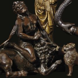 in bronzo patinato raffigurante Sansone e il leone, in cui la bocca spalancata dell’animale funge da calamaio. Il modello di questo gruppo è stato in passato variamente attribuito a diversi artisti, da Pollaiolo a Tiziano Aspetti, per arrivare con Anthony Radcliffe a Bernardino Danese, bronzista romano del diciassettesimo secolo, che ha notato somiglianze tra il leone del calamaio e i due leoni che adornano il piedistallo del busto di Paolo Giordano II Orsini conservato nel Museo di Plymouth. Anche quest’attribuzione non ha però convinto definitivamente la critica, ed infatti un esemplare analogo al nostro, conservato al Metropolitan Museum di New York (inv. n. 1982.60.107), è schedato con attribuzione generica ad artista italiano del XVII secolo; cm 19x17x13