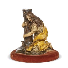 in terracotta policroma raffigurante Maria Maddalena raffigurata inginocchiata a terra nell'atto di abbracciare un tronco, e accanto a lei una piccola urna con coperchio; cm 18x17x14