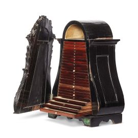 in legno ebanizzato e riccamente intagliato a motivi vegetali, corpo di forma sagomata con sportello sul fronte impreziosito da quattro medaglioni ovali in pietre dure e tenere, due dei quali con intarsi su fondo; all'interno serie di tiretti con vassoi portamonete e vano a giorno nella parte superiore, cm 60x43,5x23