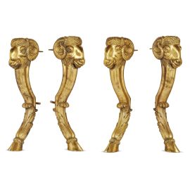 in bronzo dorato sagomate in forma di zampe caprine sormontate da teste di ariete, cm 45x10x20