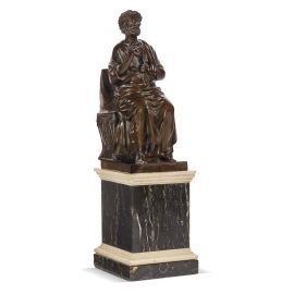 in bronzo raffigurante San Pietro in trono, modello derivato dalla scultura conservata nella basilica di San Pietro a Roma, cm 36,5x14x21; montata su base in marmo verde e bianco, alt. cm 22,5