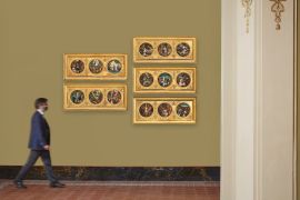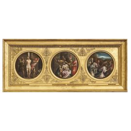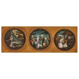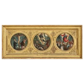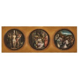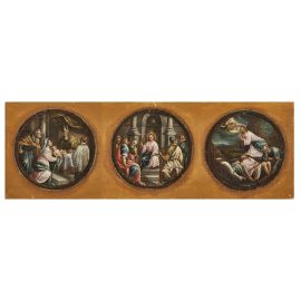 cinque predelle con quindici tondi suddivisi in gruppi da tre, olio su tela, cm luce 15,5 (ciascuna), cm 65x22,5 (totale)