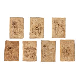 sette rilievi in terracotta di forma rettangolare raffiguranti l’Ingresso degli animali nell’arca, Mosè salvato dalle acque, Il bastone di Mosè mutato in serpente, Batuele e il messo di Abramo, Giuditta al campo di Oloferne, La testa di Oloferne issata sulle mura di Betulia, La morte dei primogeniti del Faraone. Secondo Andrea Bacchi queste formelle vanno collegate ad una delle più prestigiose imprese monumentali della scultura di fine Cinquecento nell’Italia centrale: la realizzazione delle tre porte in bronzo del santuario di Loreto, commissionate dal cardinale Antonio Maria Gallo, rettore del Santuario a partire dal 1587, in vista del giubileo del 1600. Tutte e tre le porte, eseguite rispettivamente da Antonio Calcagni, Antonio di Girolamo Lombardo e Tiburzio Vergelli, illustrano episodi dell’antico testamento; cm 22,5x15,8 circa ciascuno