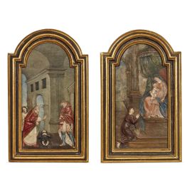 coppia di rilievi centinati in stucco dipinto in policromia entro cornici in legno, cm 64x32