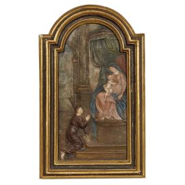 School of 18th century, Orant Faithful and Extreme unction, a pair of polychrome stucco reliefs