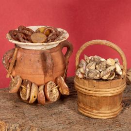testa in terracotta policroma, mani e piedi in legno dipinto, occhi in vetro, manichino in fil di ferro ricoperto di stoppa, abbigliato con camicia in tela, panciotto, giacca e brache in panno marrone, fusciacca a righe e fazzoletto al collo, sulla testa porta un berretto, alt. cm 28; accessori: due ceste contenenti frutti di mare e un vaso in terracotta su cui poggia un piatto in ceramica contenente polpo con limone e friselle, su basamento in sughero