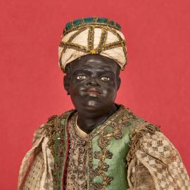 testa in terracotta policroma, mani e piedi in legno dipinto, occhi in vetro, manichino in fil di ferro ricoperto di stoppa, abbigliato con gilet in seta verde con ricami in oro e pizzo sulle maniche, camicia e panciotto bianco con ricami in oro e brache in stoffa a quadri turchesi, sulla testa turbante bianco e azzurro con dettagli dorati, alt. cm 33
