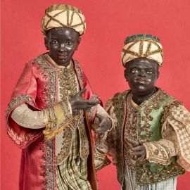 testa in terracotta policroma, mani e piedi in legno dipinto, occhi in vetro, manichino in fil di ferro ricoperto di stoppa, abbigliato con lungo cappotto rosso operato in argento e gilet crema ornato in oro, braghe a quadri verdi e bianchi, indossa turbante color cipria e ocra e stivali rossi ai piedi, alt. cm 32