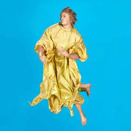 teste in terracotta policroma, mani e piedi in legno dipinto, occhi in vetro, manichino in fil di ferro ricoperto di stoppa. Composto da: angelo abbigliato con veste in seta bianca e camice verde, alt. cm 45, e angelo abbigliato con veste in seta gialla, alt. cm 46