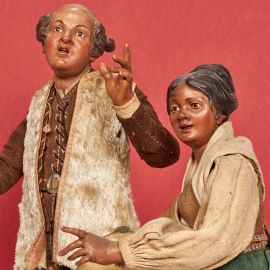 testa in terracotta policroma, mani e piedi in legno dipinto, occhi in vetro, manichino in fil di ferro ricoperto di stoppa, abbigliata con camicia bianca in tela sotto il corpetto ocra, scialle stretto sulle spalle, ampia mantella stretta da cordino azzurro che ricade sulla spalla destra, gonna verde, alt. cm 36,5; accessori: tamburello sul quale è raffigurato sui toni del rosso un castello entro paesaggio