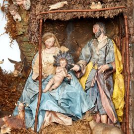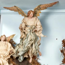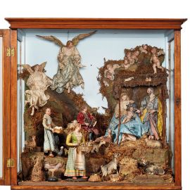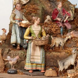 teste in terracotta policroma, mani e piedi in legno dipinto, occhi in vetro, manichino in fil di ferro ricoperto di stoppa. Composta da: Vergine seduta, abbigliata con vesti in seta cipria e mantello turchese, alt. cm 35, tiene tra le braccia il Gesù Bambino in terracotta con aureola in argento, alt. cm 12; San Giuseppe, abbigliato con cappotto e pantaloni in seta azzurra e rossa, con stola in seta ocra, alt. cm 35; alle loro spalle il bue e l’asinello in terracotta; un angioletto in gloria in terracotta, alt. cm 15; otto teste di cherubini e tre colombe in terracotta a incorniciare la struttura architettonica; due angeli in gloria sulla roccia, uno abbigliato con vesti in seta cipria, alt. cm 31, e l’altro con veste in seta cipria e svolazzo azzurro, alt. cm 33; nella parte sottostante, una fanciulla venditrice di uova, abbigliata con abito in seta celeste con corpetto a quadri e ornato in oro, impreziosito da collana, grembiule rigato a cingere la vita, regge tra le mani un cesto di uova, alt. cm 28; un giovane suonatore di triccheballacche, abbigliato con giacca in velluto rosso e pantaloni in seta rossa con finiture in passamaneria dorata, alt. cm 28; una contadina, in abiti da festa, abbigliata con corpetto cipria, verde e giallo, ornato da fiocchi rossi, gonna a quadri, cinta in vita da grembiule cipria e azzurro, regge tra le mani una cesta di piccioni, alt. cm 38; intorno completano la scena numerosi animali in terracotta. Entro teca in legno, cm 90x95,5x58, con base a console, cm 90x89x56