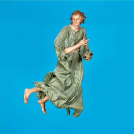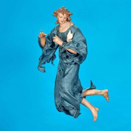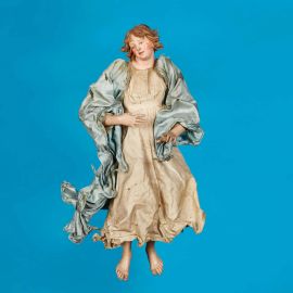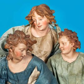 teste in terracotta policroma, mani e piedi in legno dipinto, occhi in vetro, manichino in fil di ferro ricoperto di stoppa. Composto da: angelo abbigliato con tunica in seta cipria e svolazzo celeste, alt. cm 38; angelo abbigliato con tunica in seta blu con fiocco avorio, alt. cm 37; angelo abbigliato con tunica in seta verde cinta in vita da nastro color cipria, cm 36,5
