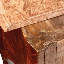 lastronato in legni vari e bois de rose con applicazioni in bronzo dorato e piano in marmo rosso; fronte di forma mossa rientrante al centro a due ordini di cassetti, di cui il primo bipartito, con bocchette e maniglie a rocaille e terminante in grembiale sagomato interessato dal medesimo decoro, angoli stondati con capitelli stilizzati e fianchi di linea sagomata con decorazione a losanga entro quadrato, poggiante su gambe arquate terminanti in sabot, cm 84x155x64,5; sul piano presenta stampigliatura ME IACOB