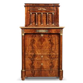 in piuma di mogano con applicazioni in bronzo dorato, alzata centrata da timpano sorretto da cinque colonne con sportello celante due ripiani; parte inferiore quadripartita con cassetto superiore centrato da testa di Medusa, sportello apribile a ribalta, con piano coperto in velluto, a celare diversi vani, cassetti e piccola scultura di Napoleone in bronzo dorato entro nicchia centrale, prosegue su due cassetti sottostanti, ai fianchi due colonne lavorate a tutto tondo, cm 199x116x58,5