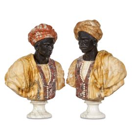 in marmi policromi e onice raffiguranti due busti di mori con turbante, su piedistallo circolare, cm 84x62x45 e cm 88x63x44; poggianti su colonne in onice, cm 126x43,5