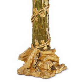 in legno intagliato, dipinto e parzialmente dorato a riprodurre albero (palma?) attorno al quale si sviluppa un festone di foglie e frutti, su basamento a riprodurre rocce, cm 276x61x58