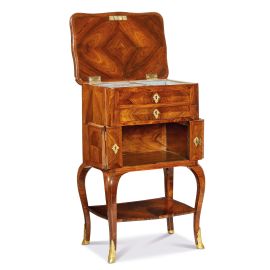 in noce lastronato in legni vari, piano di forma leggermente mossa e aggettante interessato da lastronatura a specchio e ad ali di farfalla sulla facciata interna, a celare diversi vani sul primo cassetto in trompe-l’oeil, un cassetto sottostante mentre il terzo cassetto nasconde un vano chiuso da due antine apribili a scorrimento e pieghevoli all'indietro; ripiano interposto fra gli alti sostegni sinuosi terminanti con piedi a zoccolo e calzari in bronzo dorato, cm 76x47,5x34