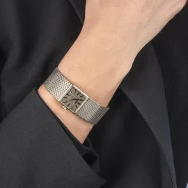 cassa di forma quadrata in oro bianco 18kt, fondello a pressione, quadrante in oro bianco "a maglia tessita", indici e logo Bulgari applicati, movimento Juvenia a carica manuale cal 765, bracciale integrato a maglia tessita in oro bianco 18kt con chiusura a scomparsa, lungh. cm 16,5 circa, vetro plastica, gr. 49. Dim. mm 19x19