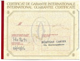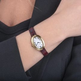 cassa di forma ovale a doppio godron in oro giallo 18kt, fondello serrato con viti, corona con zaffiro cabochon, lunetta a scalino in oro giallo, quadrante bianco, grafica nera, numeri romani, movimento a carica manuale, cinturino in pelle bordeaux firmato Must de Cartier, lungh. interna cm 17, chiusura deployant originale in oro giallo 18kt, vetro minerale, gr. complessivi 30. Dim. mm 22x31. Corredato di scatola e garanzia.