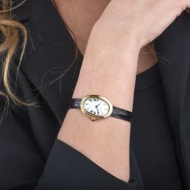 cassa di forma ovale a doppio godron in oro giallo 18kt, fondello serrato con viti, corona con zaffiro cabochon, lunetta a scalino in oro giallo, quadrante bianco, grafica nera, numeri romani, movimento a carica manuale cal ETA 2512-1, cinturino in pelle nera firmato Must de Cartier, lungh. interna cm 18, chiusura deployant originale in oro giallo 18kt, vetro plastica, gr. complessivi 30. Dim. mm 22x31.