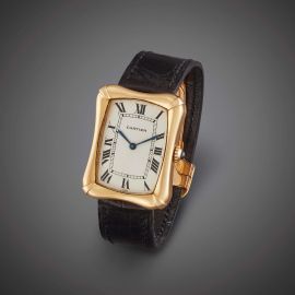 cassa di forma in oro giallo 18kt, fondello serrato con viti, corona con zaffiro cabochon, lunetta finemente decorata con motivo a canne di bambù, quadrante color avorio, numeri romani, movimento a carica manuale, cinturino in pelle nera, fibbia deployant in oro giallo 18kt firmata Cartier, vetro minerale, gr. 55. Dim. mm 26x38