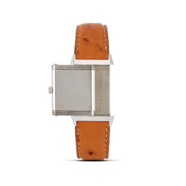cassa di forma rettangolare con sistema a scorrimento e alloggio in acciaio, corona marcata, quadrante argenté guillochè, grafica nera, numeri arabi stampati, secondi a ore sei, movimento a carica manuale, cinturino in pelle marrone non originale, fibbia in acciaio marcata Jaeger LeCoultre, vetro minerale. Dim. mm 23x40. Corredato di scatola, controscatola, garanzia e libretto.