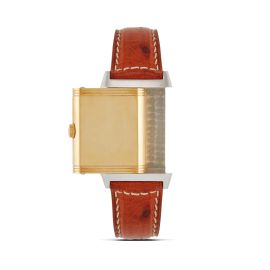 cassa di forma rettangolare in oro giallo 18kt con sistema a scorrimento e alloggio acciaio, quadrante argenté, grafica di colore nero, numeri arabi stampati, movimento a carica manuale, cinturino originale in pelle marrone, fibbia in metallo marcata Jaeger LeCoultre, vetro minerale, gr. 66. Dim. mm 26x43. Corredato di scatola e garanzia.