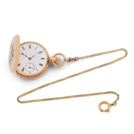 cassa in tre parti in oro giallo 18kt, fondello liscio, coperchio "a occhio di bue", quadrante bianco in porcellana, grafica nera, numeri romani, movimento a carica manuale, vetro plastica, gr. 80. Diam. mm 46. Accompagnato da catena in oro giallo 18kt a maglia groumet ed elementi rigidi, lungh. cm 37, gr. 11. Corredato di scatola originale, garanzia e lettera della maison quale estratto degli archivi datata 1975.