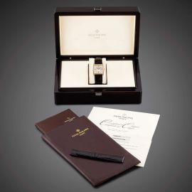 cassa di forma in oro rosa 18kt, fondello serrato con viti, corona marcata, lunetta trapezoidale, quadrante panna, grafica nera, numeri romani e indici stampati, movimento a carica manuale cal 215, cinturino non originale in pelle nera, fibbia in oro rosa 18kt marcata Patek Philippe, vetro minerale, gr. 50. Dim. mm 30x35. Corredato di scatola, controscatola, garanzia e cinturino originale in pelle nera.