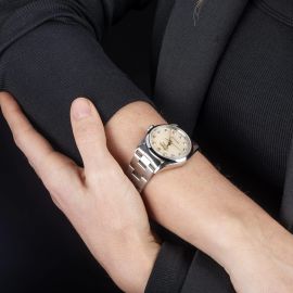 cassa in acciaio, fondello serrato a vite, corona marcata, quadrante in madreperla, grafica nera, indici con brillanti, movimento a carica automatica cal 3000 n. 14858961, bracciale oyster a maglie piene ref. 78350 finali 557B, lungh. interna cm 19, chiusura a scatoletta marcata Rolex, vetro minerale. Diam. mm 35. Corredato di scatola.