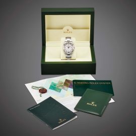 cassa in acciaio, fondello a vite marcato internamente 2080, corona marcata, ghiera bidirezionale zigrinata in oro bianco, quadrante bianco, grafica nera, indici applicati, datario in rosso a ore tre con lente cyclope, movimento a carica automatica cal 3135 n. 31161772, bracciale oyster in acciaio ref. 72200, cod. produzione OP10, lungh. interna cm 18 circa, chiusura originale a scatoletta, vetro minerale. Diam. mm 36. Corredato di scatola, controscatola, garanzia e libretto.