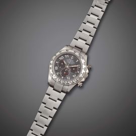 cassa in oro bianco 18kt, fondello e tasti del crono a vite, corona marcata, ghiera con scala tachimetrica, quadrante grigio/argentè, grafica bianca, indici e numeri arabi al superluminova, tre contatori con lancetta in rosso, secondi a ore sei, movimento a carica automatica, bracciale oyster a maglie piene in oro bianco 18kt con chiusura a scatoletta in oro bianco marcata Rolex, ref. 78599 cod. produzione PJ3, lungh. interna cm 20, vetro minerale, gr. 216. Diam. mm 40.