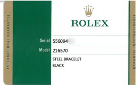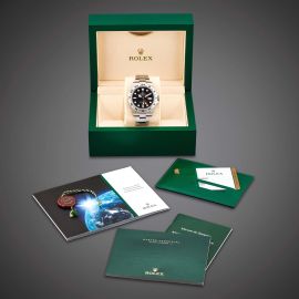 cassa in acciaio, fondello serrato a vite, lunetta fissa in acciaio graduata a ventiquattro ore, corona marcata, quadrante nero, grafica bianca, indici bicchierini al superluminova, datario a ore tre con lente cyclope, movimento a carica automatica, bracciale oyster in acciaio a maglie piene cod. produzione X0H, lungh. interna cm 20, chiusura a scatoletta marcata Rolex, vetro minerale. Diam. mm 42. Corredato di scatola, garanzia, libretto e due maglie aggiuntive.