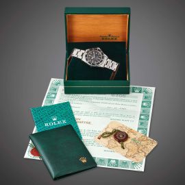 cassa in acciaio, fondello a vite, corona marcata, valvola elio sul lato sinistro, ghiera girevole con inserto nero, quadrante nero matt, grafica bianca, indici pallettoni al trizio, datario a ore tre, movimento a carica automatica cal 3035 n. 0993181, bracciale oyster a maglie piene in acciaio ref. 93160 finali 592, lungh. interna cm 18 circa, chiusura a scatoletta in acciaio marcata Rolex, vetro minerale. Diam. mm 40. Corredato di scatola, garanzia, calendario, libretto di istruzioni Submariner e due maglie aggiuntive.