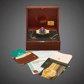 cassa in oro giallo 18kt, fondello serrato a vite marcato internamente 16610, corona marcata, ghiera girevole con inserto blu, quadrante blu, grafica oro, indici bicchierini al trizio, datario a ore tre con lente cyclope, movimento a carica automatica cal 3135 n. 5791953, bracciale oyster a maglie piene in oro giallo 18kt ref. 92908 finali 46B, lungh. interna cm 20, chiusura a scatoletta marcata Rolex, vetro minerale, gr. 176. Diam. mm 40. Corredato di scatola, controscatola, garanzia, libretti, fazzoletto, calendario e ancora Submariner. Eccellenti condizioni.
