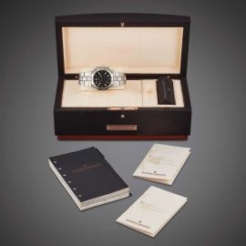 cassa in acciaio, fondello serrato con viti recante incisione di veliero, pulsanti a vite, corona marcata, quadrante nero, grafica argento, indici applicati, numeri arabi, grande data a ore dodici, tre contatori, secondi a ore sei, movimento a carica automatica, bracciale a maglie in acciaio, lungh. interna cm 18, chiusura deployant in acciaio marcata Vacheron Constantin, vetro minerale. Diam. mm 42. Corredato di scatola, libretto e garanzia non corrispondente.