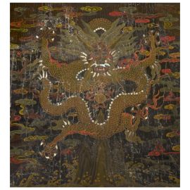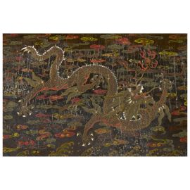 Questo tavolo-altare di tipo qiaotou an presenta le estremità del piano leggermente rialzate e le gambe rastremate verso l’interno. L’intera superficie è rivestita di lacca nera, arricchita da pitture policrome e intarsi di madreperla raffiguranti ben 32 draghi fra le nubi. Tre draghi dominano la parte centrale con posa vigorosa, mentre gli altri—alcuni intenti a giocare con la Perla Fiammeggiante—decorano le sezioni laterali. Le tessere di madreperla, sottili come ali di cicala, sono state intarsiate nella lacca per ottenere un effetto di intensa iridescenza. Capolavoro dell’ebanisteria laccata dell’epoca Ming, emblema di maestria tecnica e raffinatezza imperiale.