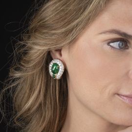 in oro giallo e bianco 18kt, impreziositi da due smeraldi centrali taglio sugar loaf per ct 18 circa, smeraldi taglio baguette per ct 0.70 circa e pavé di diamanti taglio brillante per ct 7.40 circa, chiusura a clip con perno, punzone 750, dim. cm 2,5x3, gr. 28 complessivi