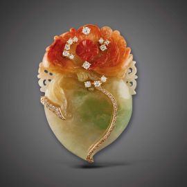 realizzato in giada incisa, con struttura in oro giallo 18kt, impreziosito da diamanti taglio brillante per ct 0.80 circa, dim. cm 4x6 circa, gr. 60