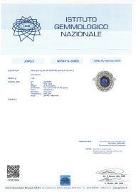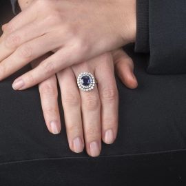 in oro bianco 18kt, impreziosito al centro da uno zaffiro birmano di ct 3.80 circa, circondato da una doppia fila di diamanti taglio brillante per ct 1.50 circa, mis. 16/56, 7. Corredato di certificato IGN del 26/02/2025 attestante l'origine geografica dello zaffiro e l'assenza di trattamenti termici.