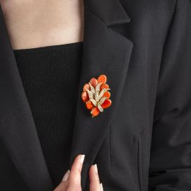 in oro giallo 18kt, realizzata a forma di grappolo, impreziosita da elementi in corallo e diamanti taglio huit huit per ct 3.30 circa, punzoni 750 e del fabbricante, dim. cm 4x5,5, gr. 33
